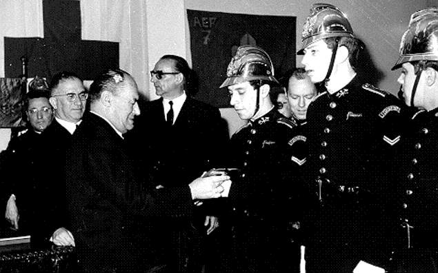 Foto 1- Cerimónia no Quartel dos B.V.Lisbonenses, em 1969 com o Comandante.França de Sousa,na altura oficial da GNR a passar revista, à guarda de honra prestada pelos BVL,na rua Camilo Castelo Branco, com o então Presidente da Câmara Municipal de Lisboa, General França Borges- Foto do arquivo Fotog. da CML