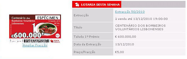 -Dia 13 de Dezembro de 2010 Lotaria comemorativa do centenário dos Bombeiros Lisbonenese